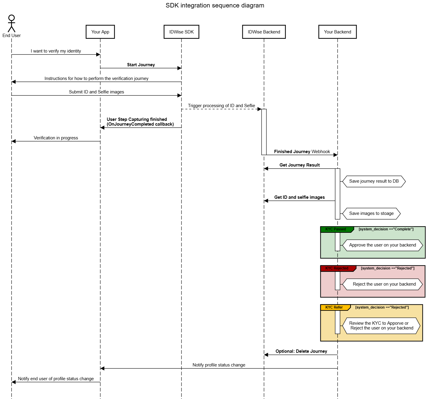 Here is a sequence diagram illustrating the steps performed after integrating the SDK with your mobile app or web application